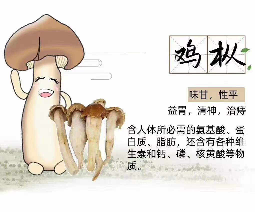 雞樅:味甘,性平益胃、清神,治痔的功效含人體所必需的氨基酸、蛋白質、脂肪。還含有各種維生素和鈣、磷、核黃酸等物質