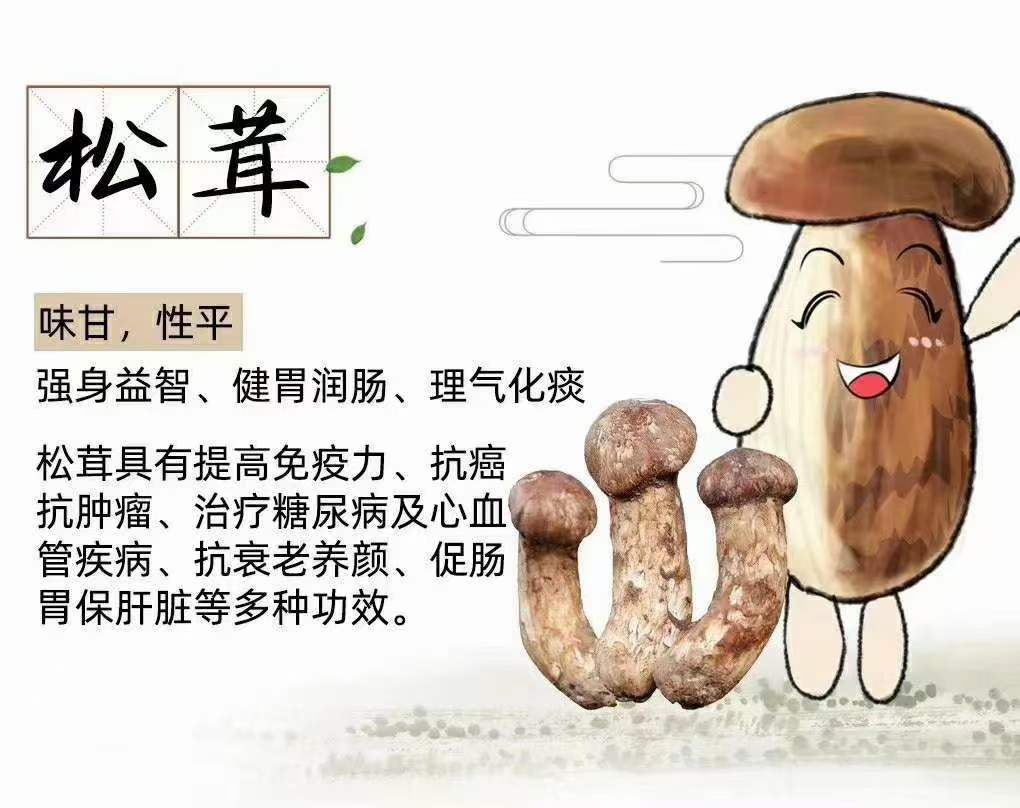 松茸:味甘、性平 強身益智、健胃潤腸、理氣止痰松茸具有提高免疫力、抗癌抗腫瘤、治療糖尿病及心血管疾病、抗衰老、養顏、促腸胃保肝臟等多種功效